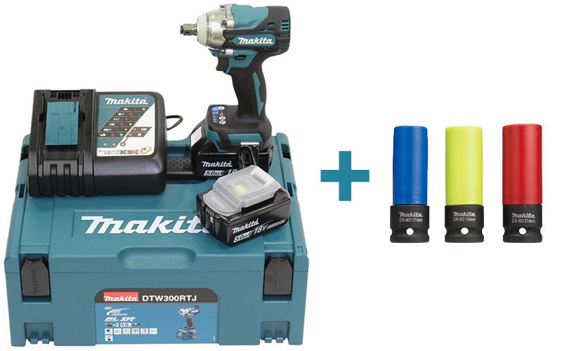 Unter allen richtigen Antworten verlosen wir einen Makita 18V Akku-Schlagschrauber DTW300RTJ (inkl. 2× Akku BL1850B, Schnellladegerät DC18RC, MAKPAC Gr. 2) + Schlagnuss-Set KFZ E-12354.