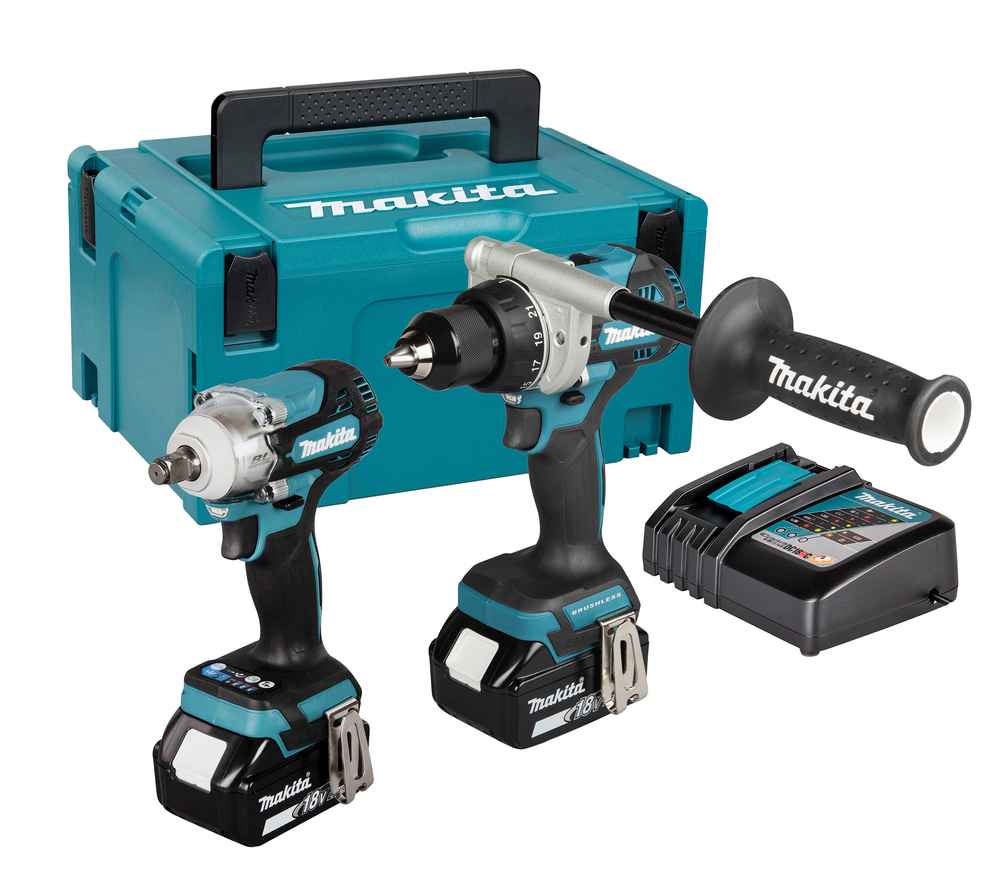 Beinhaltet einen Akku-Bohrschrauber DDF492 mit einem max. Drehmoment von 141 Nm und einen Akku-Schlagschrauber DTW300Z mit 1/2"-Außenvierkant-Werkzeugaufnahme und einem max. Drehmoment von 330 Nm. Zusammen mit Ladegerät DC18RC, 2 Akkus BL1860B mit je 6,0 Ah zusammen ordentlich verstaut in einem MAKPAC Gr. 3.