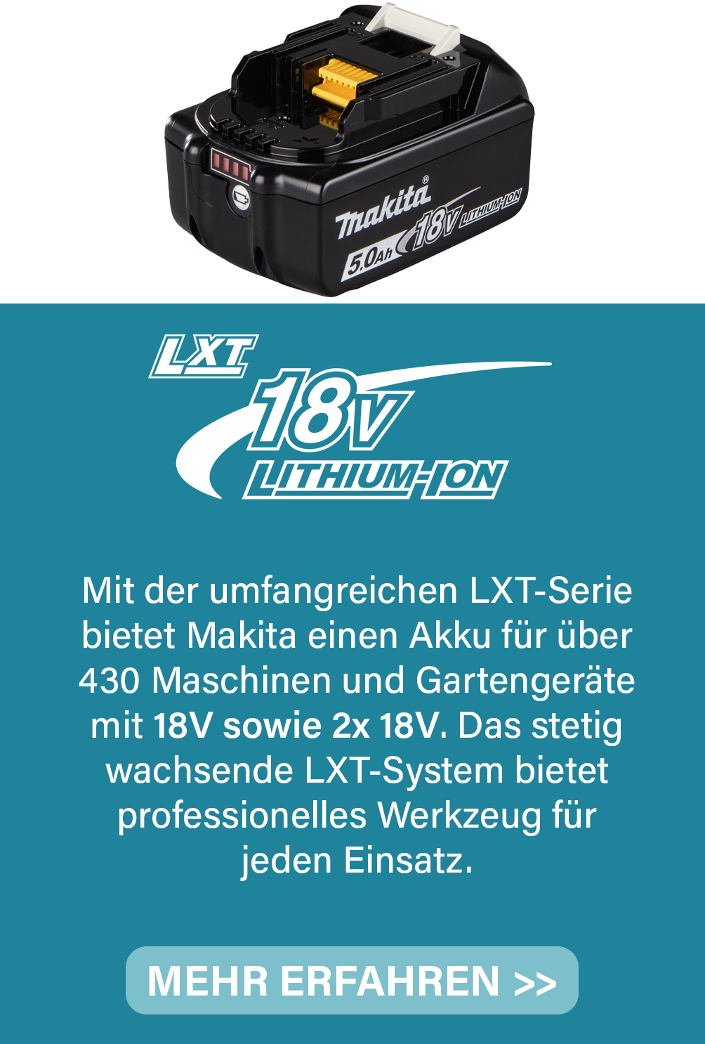 Mit über 100 Jahren Erfahrung in der Entwicklung fortschrittlicher Maschinen setzt Makita die neuesten Innovationen ein, um die besten Akku-Werkzeuge der Welt zu entwickeln und herzustellen. Die japanische Kultur zeichnet sich durch ein ständiges Streben danach aus, besser und effizienter zu werden. Auf dieser Seite finden Sie Informationen über Akku-, Maschinen- und Zubehörtechnologien von Makita.